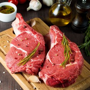 Peça de carne com elevado grau de marmoreado de gordura, fatiada com...